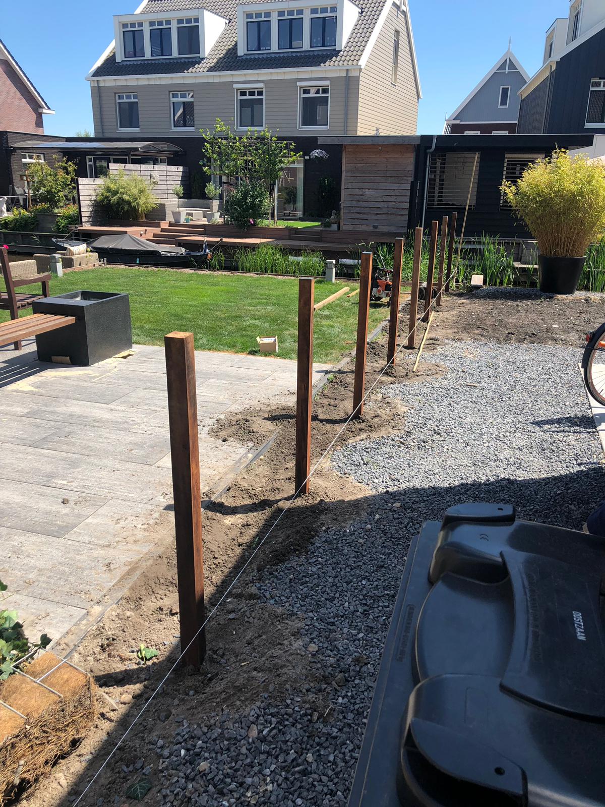 Zet nu de gaaspanelen, betongaasmatten of de Kant en Klaar Hedera Haag tegen de palen aan. Controleer goed of alles waterpas en recht staat.